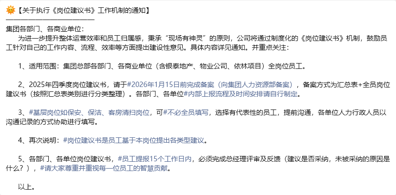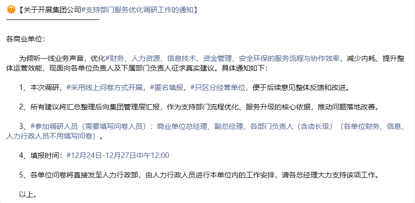 通用控股集團(tuán)2025年12月資訊發(fā)表時(shí)間:2025-12-31 10:26作者:通用控股集團(tuán) ![]() ![]() 1、12月,通用電器開(kāi)展年終“省”宴,服務(wù)暖萬(wàn)家活動(dòng),以“十免服務(wù)”感恩烏海市民的一路相伴 ![]() ![]() 2、 12月,盈澤元商廈正式啟動(dòng)智能化電表設(shè)施 ![]() ![]() 這一舉措不僅讓商戶(hù)實(shí)現(xiàn)手機(jī)繳費(fèi)、實(shí)時(shí)到賬、方便查詢(xún)、用電無(wú)憂(yōu),也讓商場(chǎng)團(tuán)隊(duì)整體提升了工作效率。同時(shí),智能電表精準(zhǔn)的計(jì)量、實(shí)時(shí)數(shù)據(jù)的監(jiān)控將助力我們優(yōu)化公共區(qū)域能耗,為商廈整體節(jié)能降本提供科學(xué)依據(jù)。 ![]() 3、12月,公司旗下華驛如家精選酒店早餐廳經(jīng)過(guò)多輪試菜與精心優(yōu)化,正式推出新菜品。本次升級(jí)同步制定了標(biāo)準(zhǔn)化的制作流程及出品規(guī)范,提升菜品口味為賓客提供更優(yōu)用餐體驗(yàn)的同時(shí),助力餐廳運(yùn)營(yíng)提質(zhì)增效 ![]() ![]() 4、12月5日,手機(jī)公司華為新品體驗(yàn)活動(dòng)火熱開(kāi)展 ![]() ![]() 華為X7新品上市暨M(jìn)ate 80新品發(fā)布會(huì)線(xiàn)上啟幕,手機(jī)公司海區(qū)華為店同步舉辦線(xiàn)下觀禮活動(dòng),邀請(qǐng)顧客到店共同見(jiàn)證新品發(fā)布時(shí)刻。 ![]() 5、12月10日,集團(tuán)公司召開(kāi)2026年經(jīng)營(yíng)規(guī)劃1.0版本匯報(bào)會(huì)。集團(tuán)各經(jīng)營(yíng)單位(對(duì)本公司2026年的各項(xiàng)經(jīng)營(yíng)規(guī)劃進(jìn)行了匯報(bào) ![]() ![]() 6、12月16日,銀光百貨組織全體員工及商戶(hù)開(kāi)展消防安全演練活動(dòng)。此次演練模擬火情突發(fā)場(chǎng)景,通過(guò)實(shí)戰(zhàn)化操作檢驗(yàn)應(yīng)急預(yù)案的可行性,為商場(chǎng)安全運(yùn)營(yíng)保駕護(hù)航 ![]() ![]() 講安全,會(huì)應(yīng)急 ![]() ![]() 7、12月21日,銀光百貨組織全體員工開(kāi)展“情暖冬至·攜手同行”主題活動(dòng),通過(guò)親手包餃子、送溫暖的行動(dòng),向商場(chǎng)內(nèi)百余家商戶(hù)傳遞節(jié)日關(guān)懷,營(yíng)造和諧共贏的營(yíng)商氛圍 ![]() ![]() ![]() 8、12月12日,集團(tuán)人力資源部組織召開(kāi)“關(guān)于人力條線(xiàn)2026年全面預(yù)算會(huì)議”,對(duì)各單位2026年人力預(yù)算的各項(xiàng)工作要求及安排做了詳細(xì)講解 ![]() ![]() 9、12月12日,為保證集團(tuán)及各單位2025年度財(cái)務(wù)數(shù)據(jù)的全面、真實(shí)、準(zhǔn)確,提升財(cái)務(wù)工作質(zhì)量,降低財(cái)務(wù)風(fēng)險(xiǎn),集團(tuán)財(cái)務(wù)部下發(fā)《關(guān)于2025年終結(jié)賬重要事項(xiàng)的通知》,對(duì)有關(guān)事項(xiàng)進(jìn)行了統(tǒng)一安排 ![]() ![]() 10、12月23日,為進(jìn)一步提升公司整體運(yùn)營(yíng)效率和員工歸屬感,集團(tuán)公司下發(fā)關(guān)于執(zhí)行《崗位建議書(shū)》工作機(jī)制的通知。旨在通過(guò)制度化的《崗位建議書(shū)》鼓勵(lì)員工針對(duì)自己的工作內(nèi)容、流程、效率等方面提出建設(shè)性意見(jiàn) ![]() ![]() ![]() 11、12月24日,為傾聽(tīng)一線(xiàn)業(yè)務(wù)聲音,優(yōu)化財(cái)務(wù)、人力資源、信息技術(shù)、資金管理、安全環(huán)保的服務(wù)流程與協(xié)作效率,減少內(nèi)耗、提升整體運(yùn)營(yíng)效能,集團(tuán)公司面向各商業(yè)單位以線(xiàn)上問(wèn)卷的方式開(kāi)展調(diào)研工作 ![]() ![]() ![]() 12、12月24日—27日,為學(xué)習(xí)對(duì)標(biāo)單位優(yōu)秀經(jīng)驗(yàn),集團(tuán)組織各高管、各部門(mén)負(fù)責(zé)人及各經(jīng)營(yíng)單位總經(jīng)理前往三禾潤(rùn)家超市開(kāi)展參觀交流。參觀結(jié)束后,結(jié)合參訪(fǎng)心得和自身崗位工作,依次在周學(xué)習(xí)分享會(huì)上進(jìn)行了分享 ![]() ![]() ![]() ![]() |